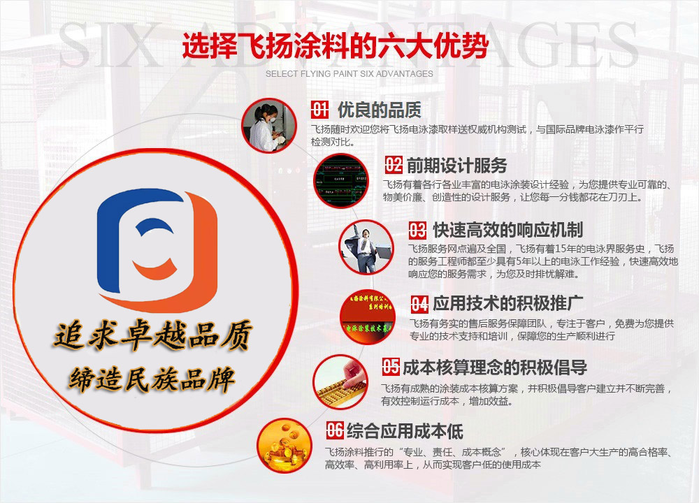 飛揚(yáng)涂料創(chuàng)立于1999年,是專注于陰極環(huán)氧電泳漆研發(fā)、生產(chǎn)、銷售和服務(wù)的電泳漆生產(chǎn)廠家,公司已通過IATF16949國際質(zhì)量管理體系認(rèn)證。“提供適合客戶的產(chǎn)品,助力客戶提高產(chǎn)品品質(zhì)、降低運(yùn)行成本、增加效益”是飛揚(yáng)立足業(yè)界的根本!...